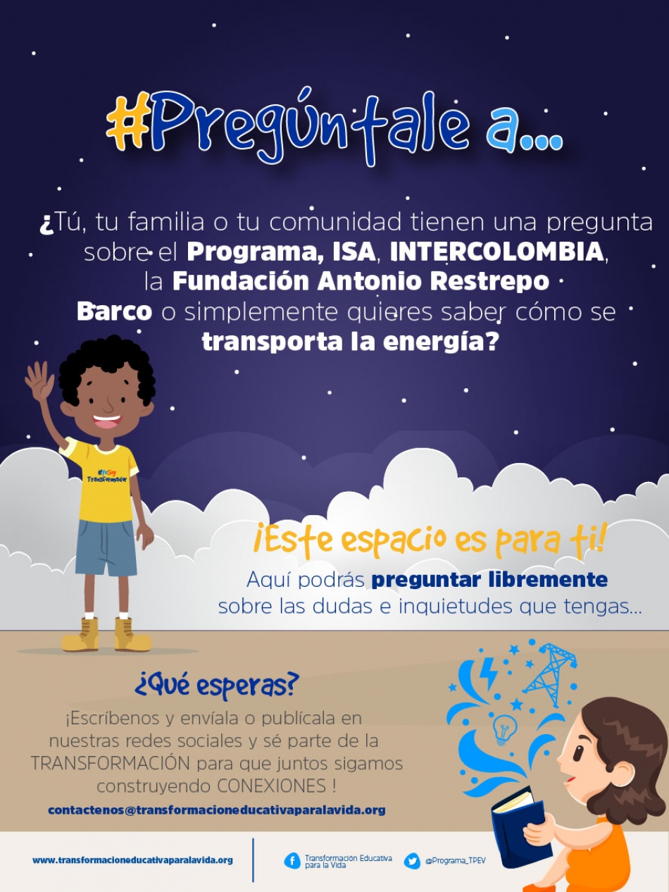 Aquí podrás preguntar libremente sobre las dudas e inquietudes que tengas respectos al Programa, la alianza, ISA, la Fundación o simplemente quieres saber cómo se transporta la energía.