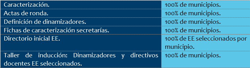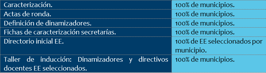 Tiene como propósito el lograr establecer condiciones “ideales” de arranque del proceso de implementación de la estrategia de acompañamiento a establecimientos educativos y de acompañamiento municipal en los territorios, que permitan gestionar los espacios de trabajo con las comunidades educativas y los tiempos de los encuentros para institucionalizarlos e incluirlos en las agendas territoriales. Duración: 2 meses.